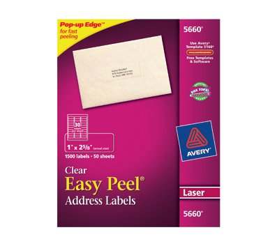 - Avery Easy Peel Clear Mailing Labels for Laser Printers, 1 x 2.62 Inches, Box of 1500 (5660)